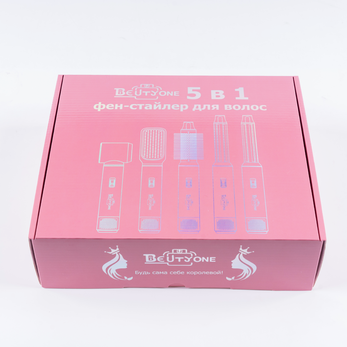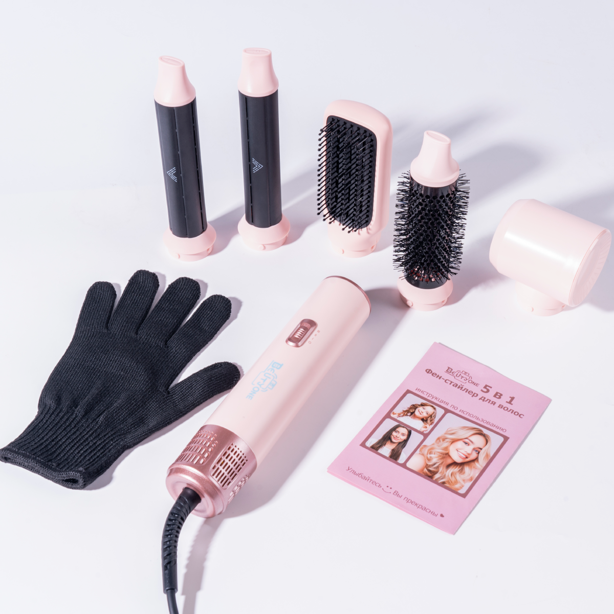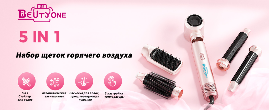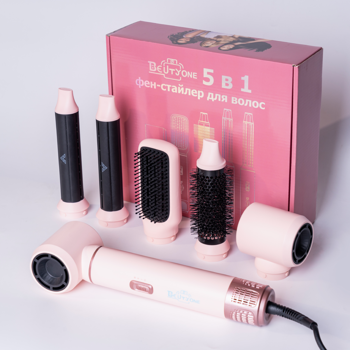 1. Мощный фен-стайлер для волос Beutyone 5-в-1 — ваш профессиональный помощник для создания идеальных причесок. Устройство сочетает функции фена, выпрямителя и плойки с интеллектуальной системой из трех температурных режимов (20°C, 78°C, 105°C), каждый с соответствующей скоростью воздушного потока для полного контроля укладки. В комплекте вы найдете набор съемных насадок: насадку-фен для быстрой сушки, щетку для выпрямления, брашинг для создания объема и две насадки-плойки (для завивки влево и вправо) для создания выразительных локонов.