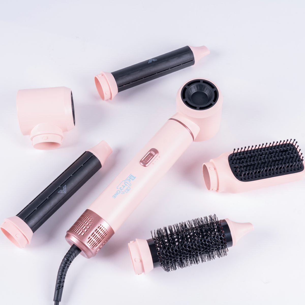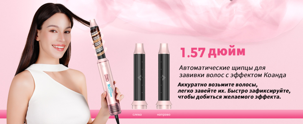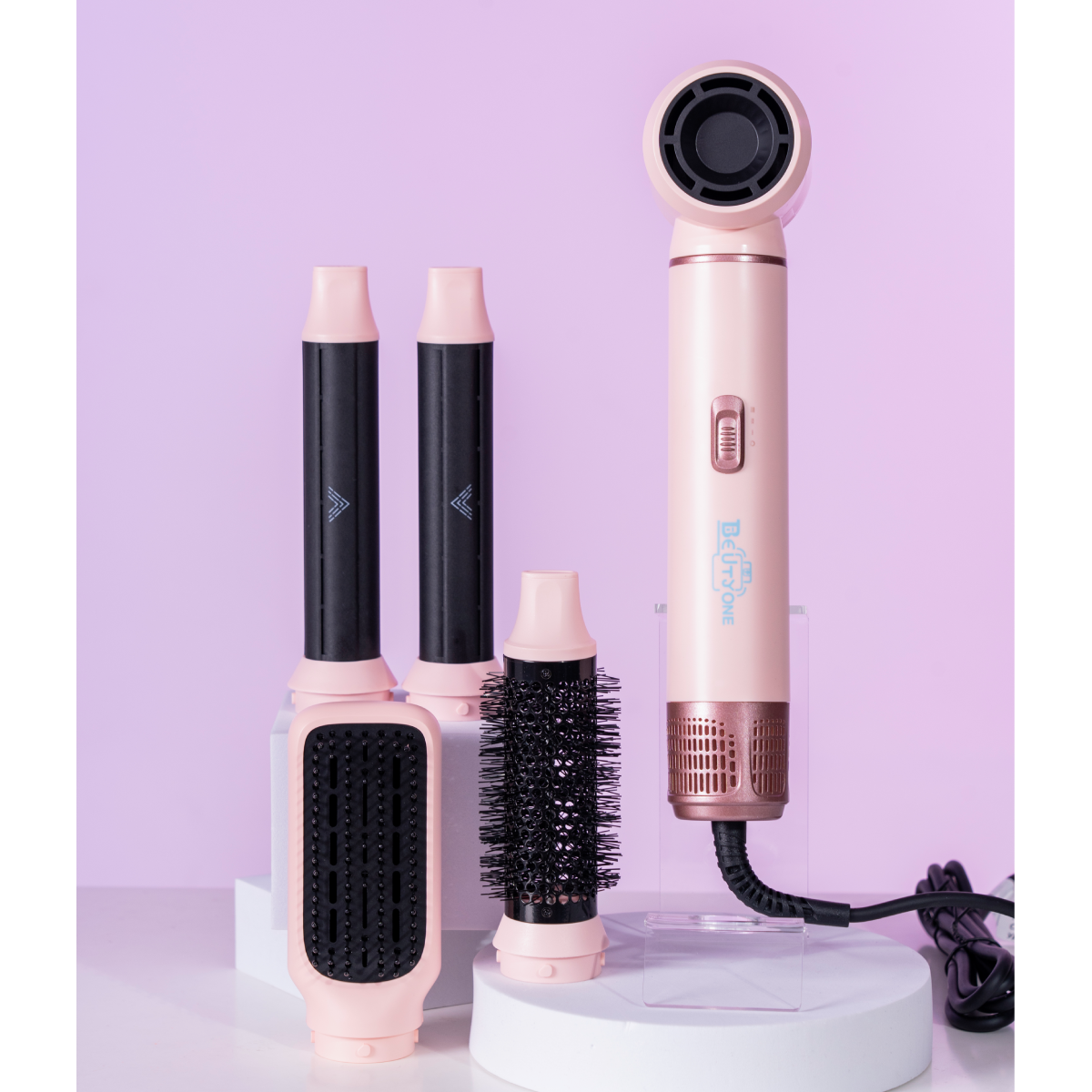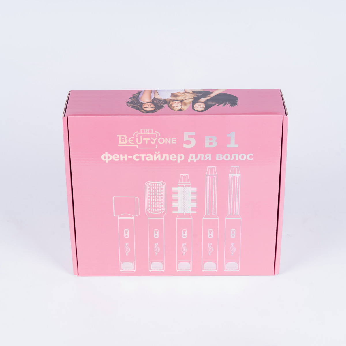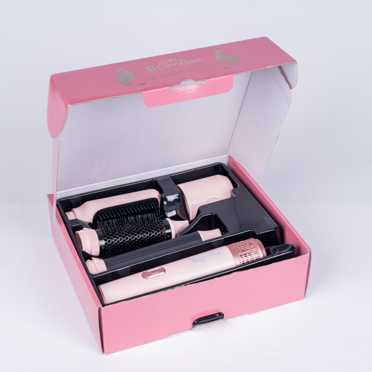 1. Мощный фен-стайлер для волос Beutyone 5-в-1 — ваш профессиональный помощник для создания идеальных причесок. Устройство сочетает функции фена, выпрямителя и плойки с интеллектуальной системой из трех температурных режимов (20°C, 78°C, 105°C), каждый с соответствующей скоростью воздушного потока для полного контроля укладки. В комплекте вы найдете набор съемных насадок: насадку-фен для быстрой сушки, щетку для выпрямления, брашинг для создания объема и две насадки-плойки (для завивки влево и вправо) для создания выразительных локонов.