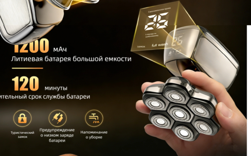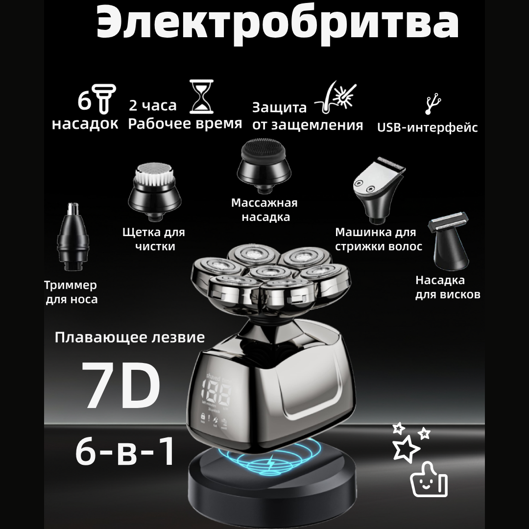Быстрая зарядка. Полная зарядка за 2 часа, время работы 60 минут. USB-кабель, беспроводная зарядка и светодиодный дисплей. Бритва для лысых мужчин, с возможностью влажного или сухого бритья. Полная водонепроницаемость корпуса IPX6. Вес упаковки цветной коробки: 402 г, размер коробки одного цвета: 18,5*16*7,8 см. Напряжение питания: 100-240 В, 5 Вт.